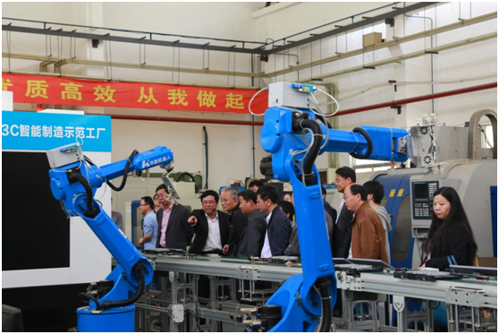 隨后,與會的各位領導和專家一行參觀華中數控公司展廳、機器人展廳、車間和3C智能制造示范車間,陳總結合實際產品詳細介紹了華中數控這幾年在技術與應用方面取得的成績,與會代表也和現場技術人員進行密切交流。