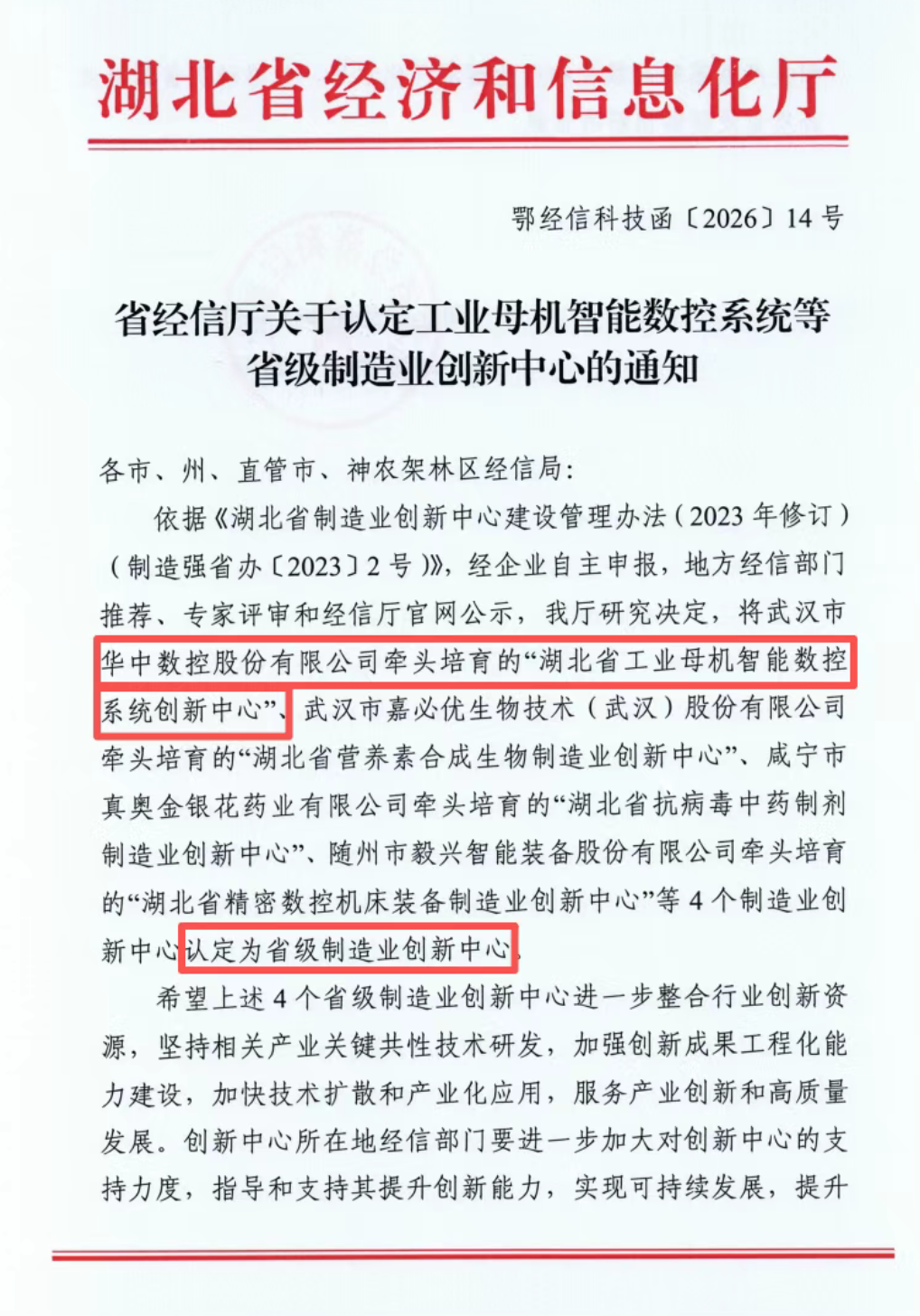 依據《湖北省制造業創新中心建設管理辦法(2023年修訂)(制造強省辦〔2023〕2號)》,經企業自主申報,地方經信部門推薦、專家評審和經信廳官網公示,我廳研究決定,將武漢市華中數控股份有限公司牽頭培育的“湖北省工業母機智...